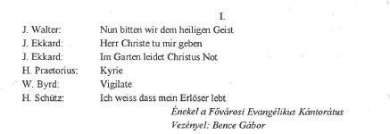„Egyházzene Josquin de Prés-től Heinrich Schützig” a Fővárosi Evangélikus Kántorátus (vez. Bence Gábor), a Győri Bazilika Palestrina Kórusa (vez. Katona Tibor) és a martosi Goudimel kórus (vez. Mórocz Ildikó) részvételével, igét hirdetett Kertész Péter református lelkész.