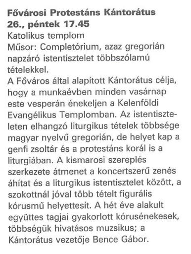 „Tegnap este tartotta zenei áhítatát a Fővárosi Protestáns Kántorátus az evangélikus templomban. Koncertjükön egy vespera liturgikus keretébe illesztve többek között J. S. Bach, H. Schütz, Michael és Hieronymus Praetorius, valamint Sulyok Imre kórusműveit szólaltatták meg. Képünk ezen a koncerten készült” – tudósított másnap a gondola.hu.