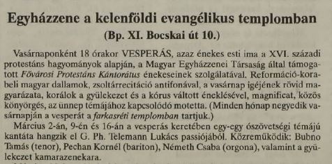 Harmadik éve szolgál a kelenföldi evangélikus templomban (XI. Bocskai út 10.) a Magyar Egyházzenei Társaság által alapított Fővárosi Protestáns Kántorátus nevű énekegyüttes, amit a Főváros Kulturális Bizottsága tart fenn. Az alapítók célja az volt, hogy biztosítsák Budapest néhány központi templomában a hetenkénti rendszerességgel megtartott énekes istentiszteletek lehetőségét. A liturgikus keret ehhez a zsoltározó esti istentisztelet: a vespera.