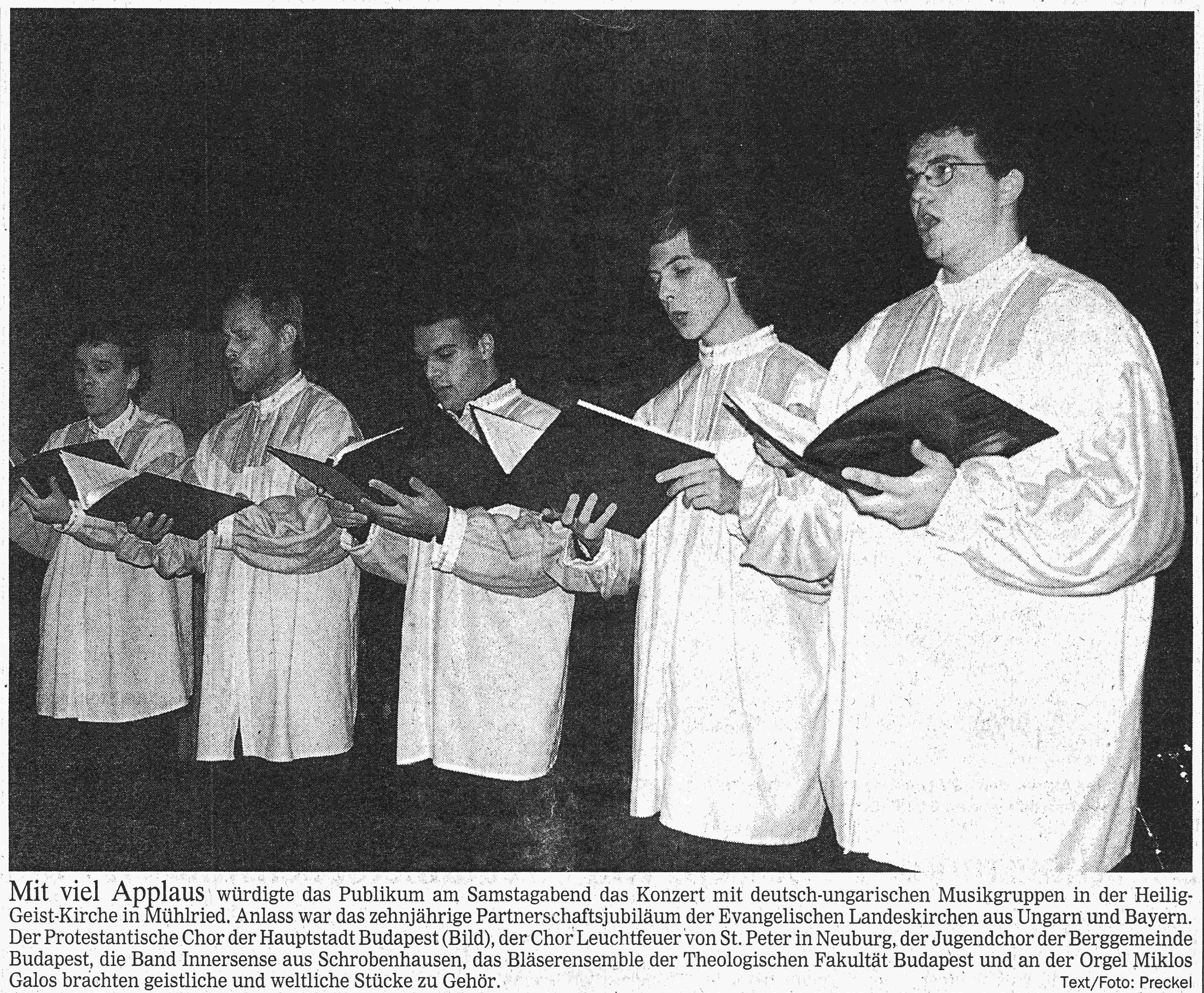 – A bajorországi meghívás oka elég prózai: az Országos Egyház munkatársai olyan kórust kerestek, amely a lehető legkisebb létszámmal színvonalas műsort tud énekelni. Ennek a kritériumnak kiválóan megfelelt a kántorátus: tizenöt énekesének többsége hivatásos zenész, vagy annak készül, így kis létszáma ellenére is vállalkozni mer igényes kórusművek előadására, a hetenkénti szolgálat mellett kialakult bőséges repertoárunkból pedig könnyen össze tudtuk állítani a szükséges műsort. Az ünnepségsorozat három napján négy különböző alkalommal énekeltünk, s mind a magyar, mind a német résztvevők elismerését kivívtuk. A helyiek külön is hálásak voltak a népszerű, de silány művek kísértésének nem engedő műsorválasztásunkért. Remélem, hogy e jól sikerült bemutatkozásnak folytatása is lehet, s talán meghívást kapunk egy hosszabb németországi útra is.