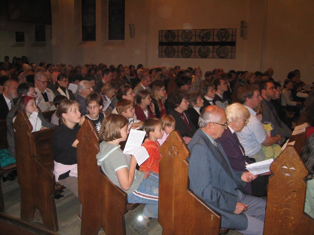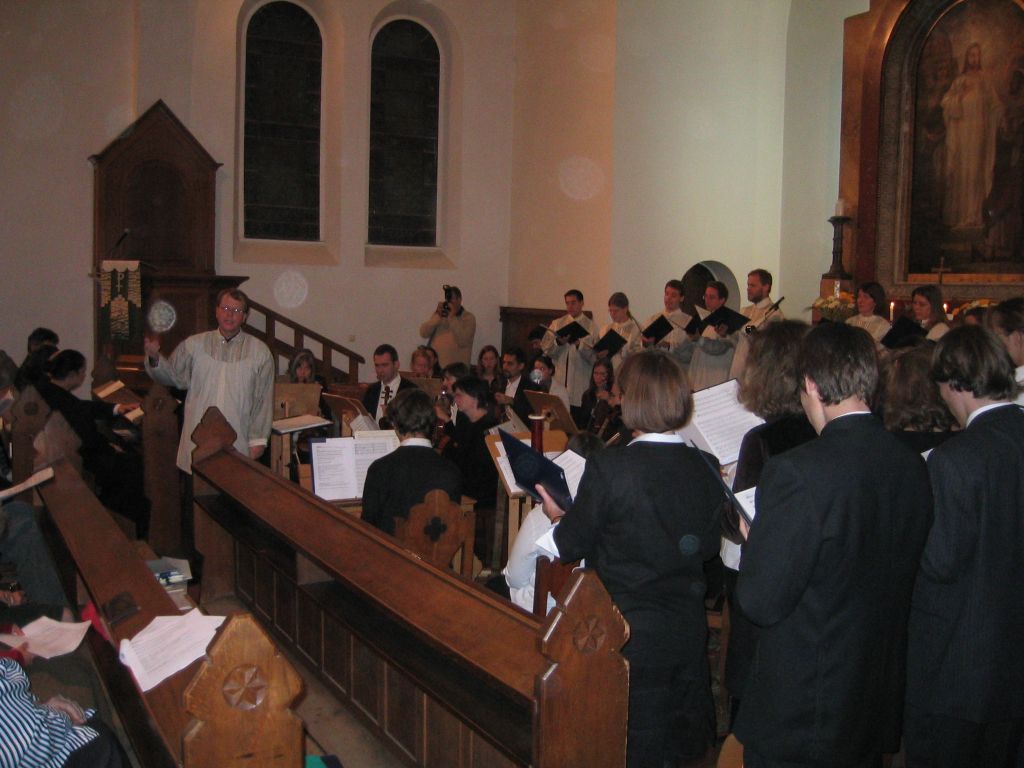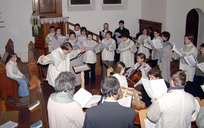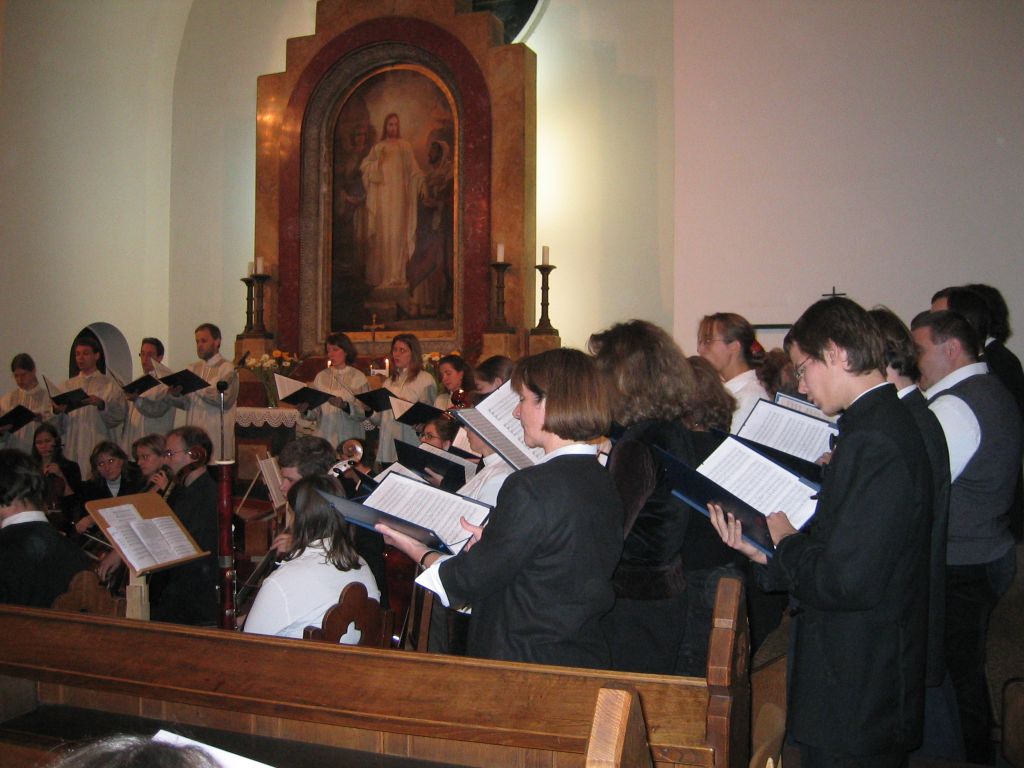 B.G.: Természetesen a 10 év alatt voltak külföldi utak, koncertek s más ünnepi alkalmak is. Ezek közül az egyik legemlékezetesebb az a Cantate vasárnapi vespera, amelyet a Budai Egyházmegye evangélikus kórusaival közösen tartottunk, s amelyen bebizonyosodott, hogy a „hagyományos amatőr kórusrepertoár” művei is beilleszthetőek a vespera liturgikus keretei közé, s ott mélyebb összefüggésrendszerbe kerülve új értelmet kapnak. A puritán istentiszteleti formákon edződött öt kórus tagsága szinte egyöntetűen megerősödött célkitűzéseiben: nem csak „általában” dolgunk „valami oda illőt” énekelni az istentiszteleteken, hanem az istentisztelet liturgiájának részévé kell tennünk tevékenységünket. De ugyanilyen szívesen emlékszem vissza olyan csendes hétköznapi alkalmakra, mint amikor például egyik altos társammal kettesben kényszerültünk végigénekelni az előírt tételeket (valami vis major a többieket elszólította), s nem vallottunk szégyent. Máskor – talán áramszünet miatt – félsötétben zajlott a szertartás, különlegesen meghitt perceket éltünk át, s a Magnificattól már szinte fejből énekelve teljesítettük a szolgálatot.
